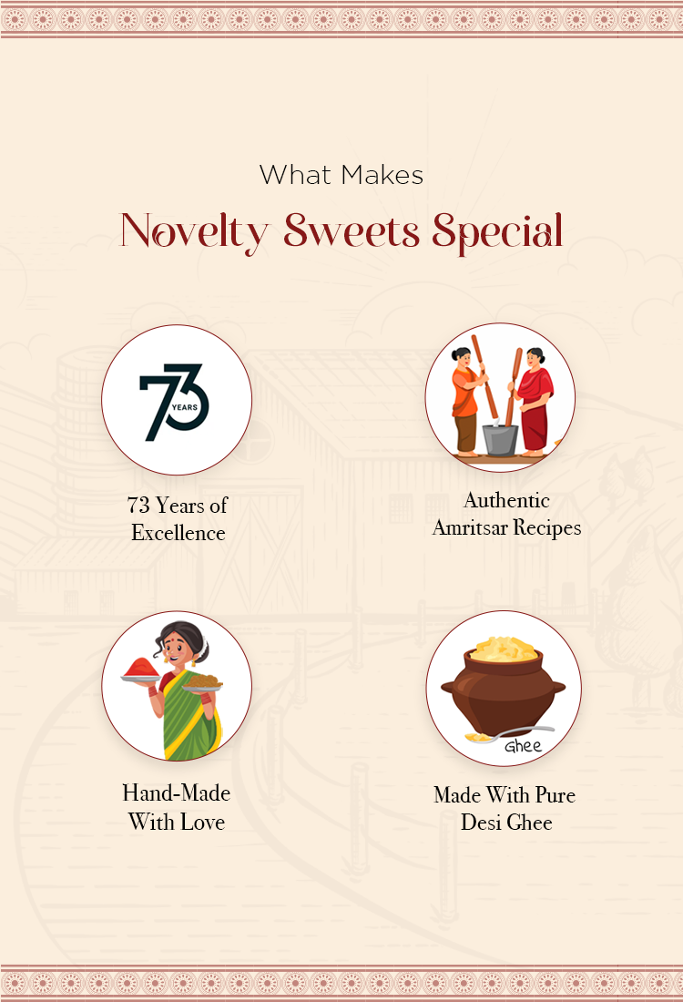 Novelty Sweets is a brand that has been serving the sweet-tooth cravings of people for over 73 years! Founded by S. Kartar Singh in 1950, at Lawrence Road, Amritsar, we have been consistently providing delicious Amritsari mithai to our customers.