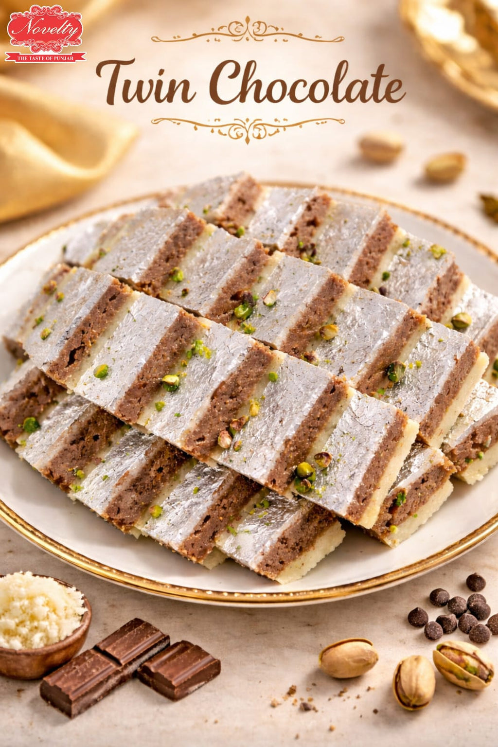 Soft, creamy, and perfectly balanced in sweetness, Twin Chocolate offers a melt-in-the-mouth experience with the richness of mawa and the indulgence of chocolate. Every piece is elegantly finished with a layer of edible silver (vark) and pista garnish on top, giving it a premium and festive look.